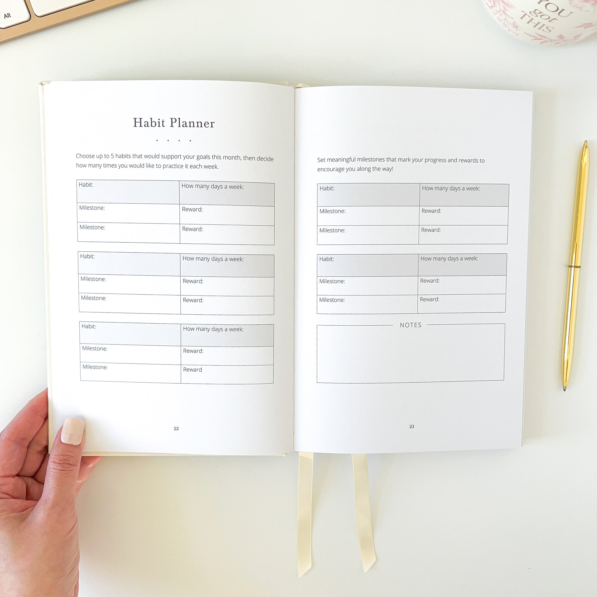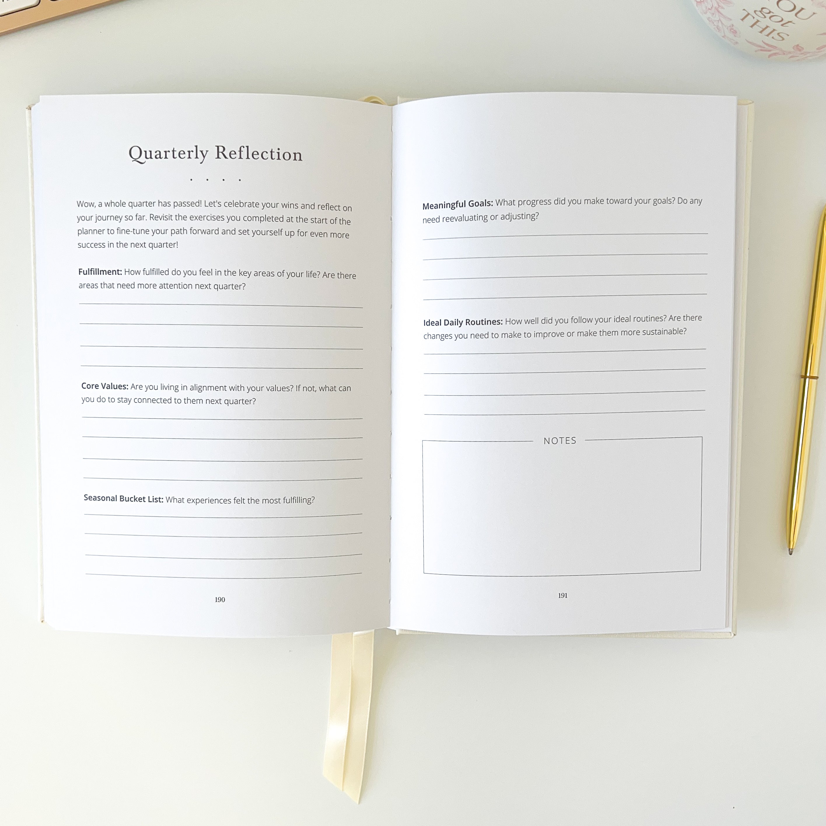 - Quarterly, monthly and weekly reflection pages to celebrate growth and reset